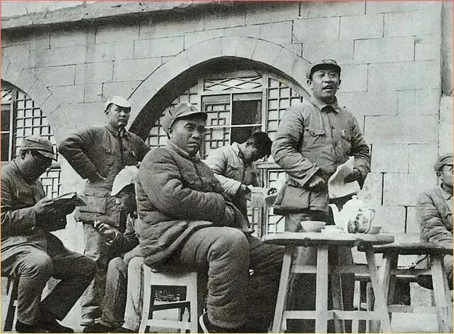 这张照.片更.有意思了.,几位.指挥员.坐在简陋.的木凳上开会,背后.是普通得不.能再普通的.民居墙面。没有宽敞的会议.室,没有讲究的桌椅,就这.么坐着商量着关乎千军.万马的大事。右边站着的那位同志,手里.还拿.着搪瓷缸子,估计会都开到一半.了,连口热水都顾不上喝。