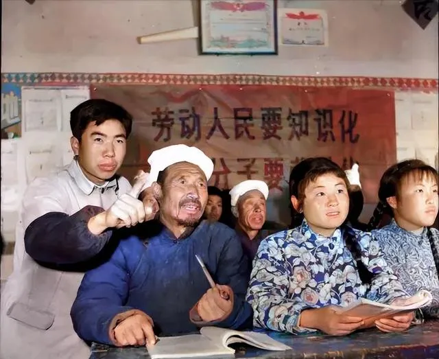 图上黑板后面横幅写得清楚,“劳动人民要知识化”,白天干完地头上的活,晚上都有老老少少挤到夜校里学字认字,老师直接站到桌前指着字读,老人小娃一个都不落下,谁要会一个字,就算有大能耐,妈妈还常玩笑说:“炕头上比的不是谁力气大,是谁算账好”,那种想把日子过明白的心气,就是从夜校一笔一划刻下去的。