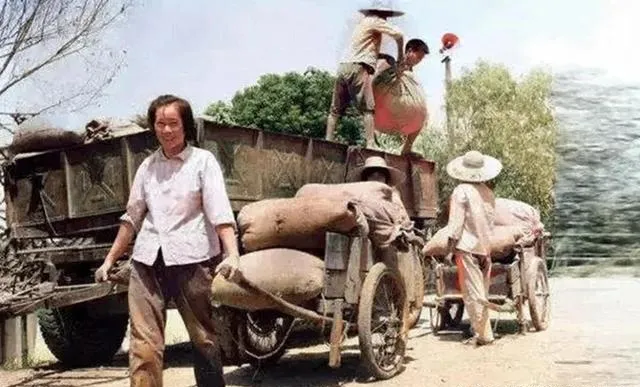 后面板车满载麻袋,前头人弯着腰喊号子推车,这种三轮车拉粮队,收秋时节最常见,家里的男劳力都得上阵,女人推,男人扛,小孩子在后头拾漏下的麦粒,爷爷说:“队里分好任务,记好工分,干多干少全明着了”,没人偷懒也没人耍滑头,每年都盼着多收点,多分点,等拉完粮了就有盼头新衣服新鞋穿。