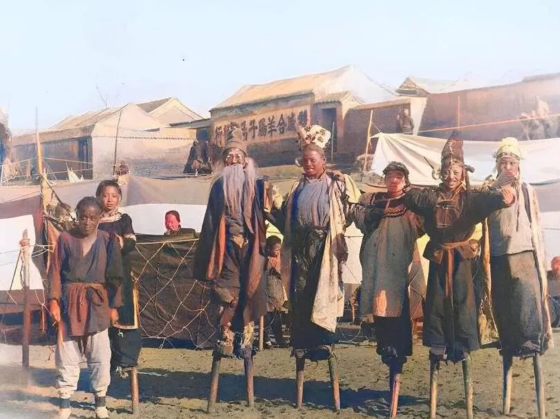 这个热闹场面叫高跷会,七八个人扎着彩头,脚下绑着木杆,胳膊挽着胳膊往前晃,后头搭着篷子,挂着手绘招牌,师傅嘴里吆喝一嗓子就开场了,妈妈说,小时候追着看,最担心他们栽跟头,结果人家稳得很,收尾一鞠躬,钱碗里就叮叮当当。