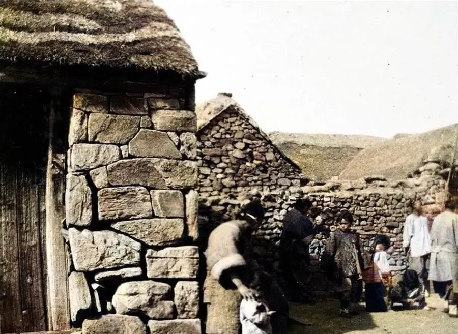 这个厚重的墙体叫乱石垒,大小不一的青石码成方角,门楣是原木色,屋顶压着草层挡雨,墙根下坐着的男人伸手去拎小孩的衣领,旁边的姑娘抠着墙缝里的苔藓,院里不宽,却装得下半日的人情味。