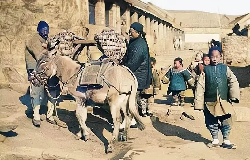 这个套在驴背上的木架叫驮鞍,两侧挂着柳条筐,口朝外,绳扣勒在胸前,后头一串孩子跟着跑,最前面那小子胳膊往袖里一缩,憋着笑,赶驴的男人嘴里嘘一声,蹄印一路踩在细沙上,到了市口,筐子一卸,换回来的就是一日三餐。