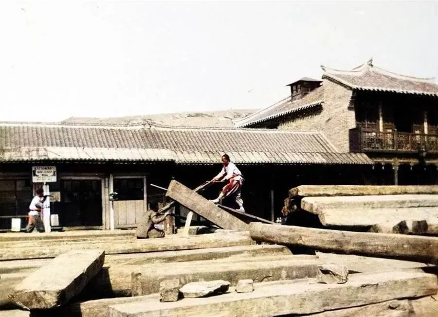 这个两头把手的家伙叫框锯,两人一上一下交替锯,木梁搭在马凳上,木屑像雨点一样落着,旁边屋檐下还挂着英文招牌,估摸着是给洋行做活的铺子,师傅腰里别着粉线袋,量一回弹一下,咔嚓咔嚓,就是一天。