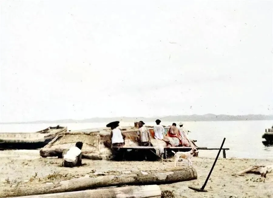 这艘顶上铺席的平底船叫沙排,岸上搁着粗木桩,船侧斜插一把长篙,几个人蹲着修补,狗在旁边绕,靠水吃水的日子不轻松,涨潮退潮都得看天色,等到夜里出汛,篙一点,水面泛出一条银线,就开张了。