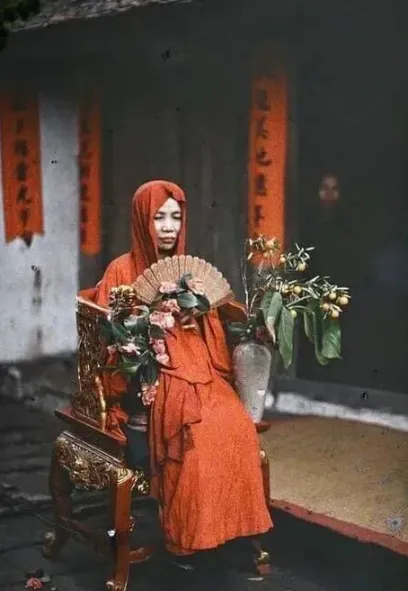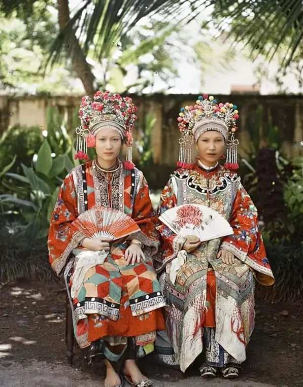 2. 凤冠霞帔、宽袍大袖再看越南富家女人们的旧照片。有的衣着讲究,保养得当,那套宽大的衣服怎么看都不陌生。 更夸张的是,有的女子身着盛装端坐在椅子上手持折扇。衣服上的繁复精美的装饰以及头戴的具有特色的帽子一看就和古代新娘子穿过的“凤冠霞帔”很像!!