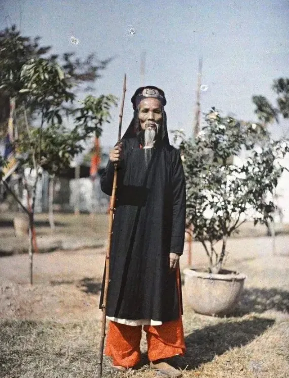2. 大清官服制度直接搬用老百姓的服饰深受中原文化的影响,越南王朝也直接“抄袭”了。 近代越南男性所穿的“长衫”,其实很像我们中国的长袍马褂。照片中的老者精神矍铄,手持龙头拐杖、旱烟袋,并且穿着中国乡绅的样子,显得十分威风凛然。 而且越南皇帝也穿龙袍,官员的朝服上绣着飞禽走兽,“补子”,武将所戴盔甲都是按照清朝的样子一模一样复制出来的。