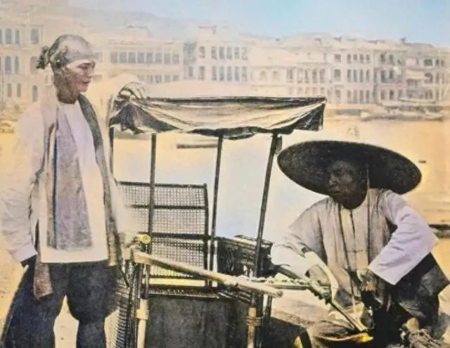 这辆带蓬的叫黄包车,竹靠背,细藤编的座面,车把子有汗印子,车夫戴斗笠蹲在一旁抹一把额头,客人脚边的烟杆亮了一下,几句话不投机也不恼,抬手再走两单,天黑前得把米面钱攒齐。