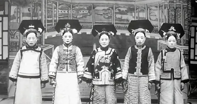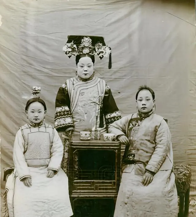 这些穿着讲究的衣裳,头上戴得高高的,是宫里做活的女人与妃嫔合影,衣料厚,边纹细,站姿都直,桌上摆着盖碗,镜头前不笑也不躲,外婆指着说看这发冠多重,走路得小步挪,不裹脚也难快起来,后来风一变,不缠小脚成了主意,街上踩着布鞋的人多了,脚步也跟着快了。