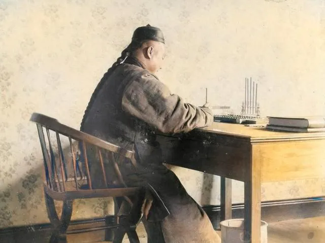 这个桌上摆了算盘和账本的人是个写字谋生的主,靠窗的光打在纸面上,手腕一抬一落,竹珠刷刷地响,脚边还放了个小桶,像是装纸团的,妈说这就是那会儿的白领活,坐着干,心细,脑子也得转得快。