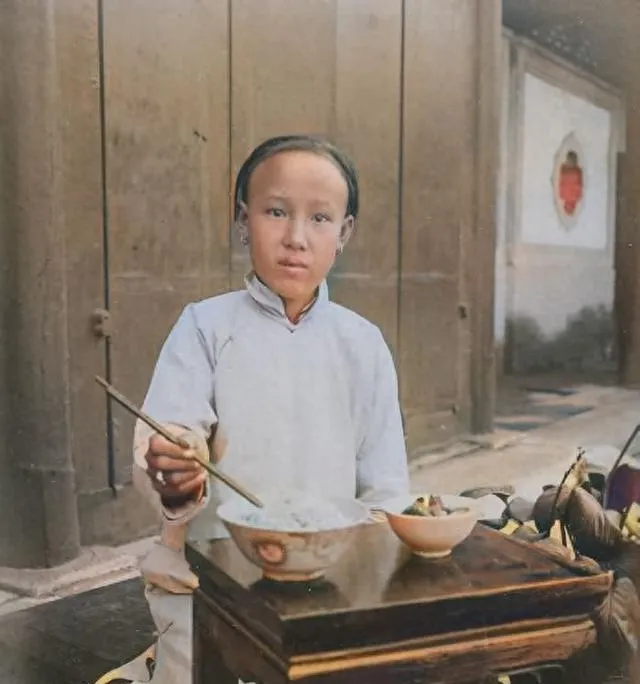 这个小几像缩小了的八仙桌,碗沿有金边儿,女孩拿筷子的架势稳,菜碟小小的,眼神不躲,家里条件不差,院门口的影壁上还有个圆窗,那时候能吃上这样一桌,也算过得去,现在看着寻常,当年可是盼头。