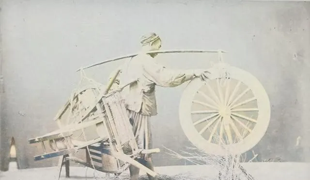 这个高轮子的车子叫牛车,辐条粗,车篷是编的柳条,车轮高过大人肩,大辫子的汉子牵着牛,绳子一道一道绕在车身上,走起来吱呀吱呀的,爸说这种车过坑不怕,慢归慢,能拉家当能拉命。