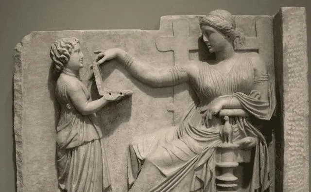 这块石板上的母子动作温和,像在递一件小卷册,边上有个线轴似的物件,房间的角落用浅浅的阴影收住,石头里竟然能刻出软的感觉,手指套着戒指,袖口起褶,细到不可思议,放到咱这边的语境里,就是学与传,谁把耐心递给谁,走到今天依旧不旧。