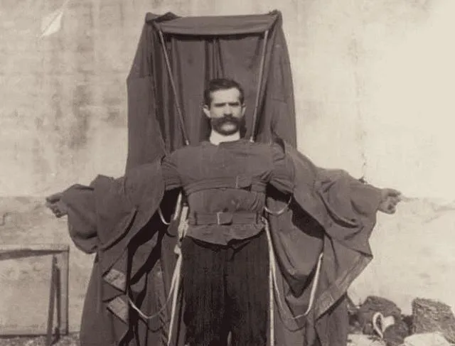 这个披着大袍子站成十字的人,穿的是降落伞衣,布面从肩背拖下来,用带子勒在腰上,像两扇还没张开的门,他把眼神往上抬,胸口起伏快,同行的人劝一声别逞强,他却笑了笑,时代走到那一步,总有人拿命去摸边界,现在安全带标准厚厚一本,我们看视频按个赞就过去了,可试错的成本从来是真血。
