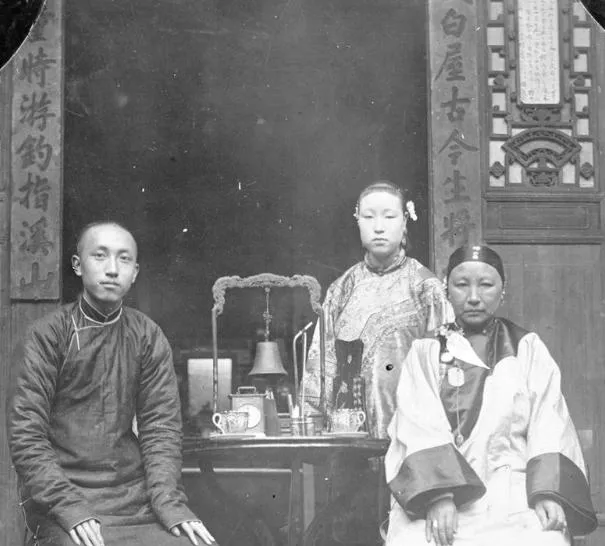 这个三人的坐照,服色稳妥,发式一看便知是清末,桌上摆了洋式茶具和铃,叫照相馆里的人生节点,有人刚做父亲,有人刚学认字,摄影师喊一声别眨眼,几秒里把一家子的精神气摁住了,现在手机里动图一大把,翻到旧照片却还是会停一下,人的认真是会过光年的。