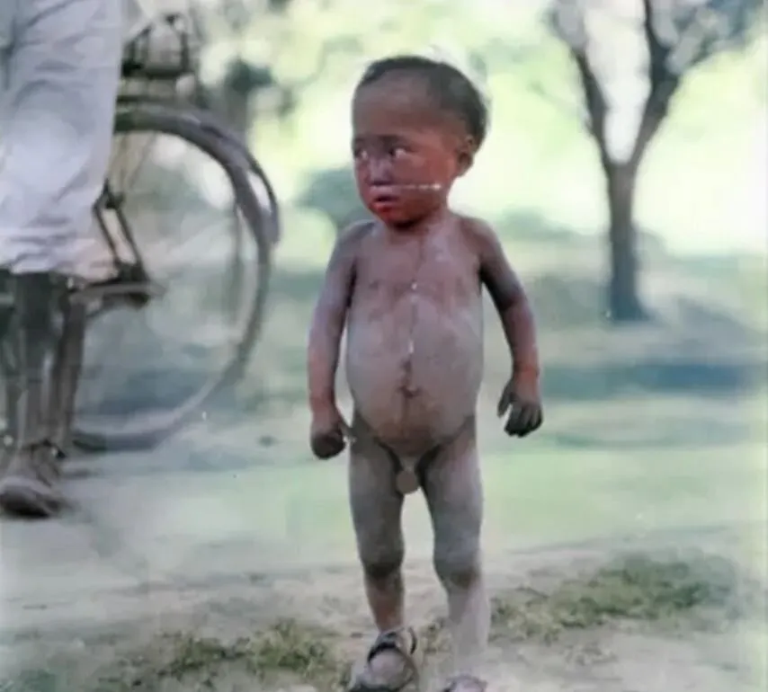 这个小家伙脚上只穿了一双绳系的小鞋,鞋面薄得像纸,脚背上全是尘灰,肚子鼓鼓的,风一吹人就瑟缩一下,这种鞋多半是布底掺着麻线,随手一扎就能穿,夏天烫脚,雨天一泡全透,可也好洗,拎到井边搓两下就干净了,妈妈说那会儿孩子鞋码不讲究,能套住就行,走在土道上啪啪作响,现在孩子鞋柜一排排,气垫减震的讲科学,这张照片却把穷人的赤脚声留了下来。