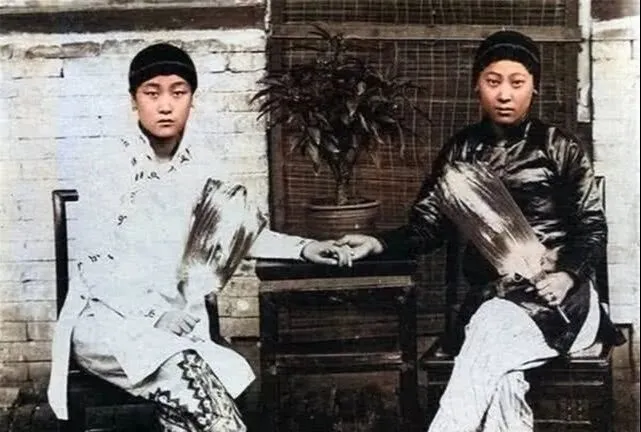 这张屋里的合影,桌上摆着一盆发亮的兰草,两个女子手里各执一把扇子,一个黑缎面发亮,一个素白压花,衣摆垂下去刚好盖住鞋面,姿态不端架却不散,像是请来师傅在家里拍的,没照相馆那种板板正正的规矩,却更有生活气,姐姐说以前的人拍照不笑,怕露齿不雅,可你看她们眼神的温度,透过扇柄的缝在说话,这就是照片的妙处,不用解释,已经懂了。