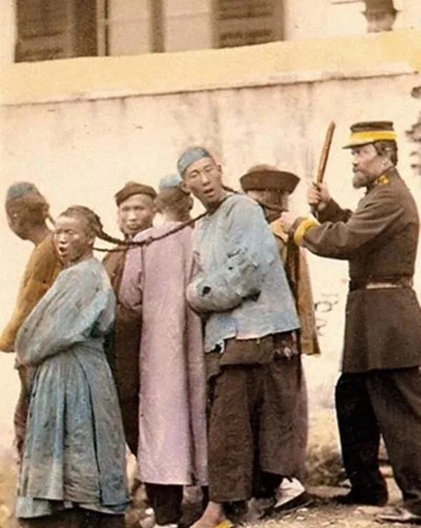 这条用辫子串在一起的队伍,真让人心口发紧,洋人手里拎着棍,几名清末的百姓被拽着往前走,衣服褶里全是土,眼神躲不过去,这种捆法最是羞辱,脖颈不敢乱动,头皮一扯眼泪就冒出来,爷爷讲过城门口的故事,谁被拿住不是先打,是先让你在人前低头,现在我们习惯在镜头前抬头,看到这张图还是会把肩膀不自觉往里缩一下,历史疼过才知道直起背有多珍贵。