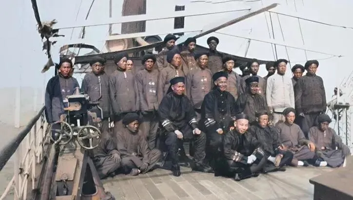 这一群站在甲板上的兄弟,不用问就是海军的苦力骨头,黑呢短褂上绣着号码,袖口做了粗带,一看就耐磨,脸被海风刮得紧,笑也不肯全开,脚下木板被盐水泡出浅灰的纹,靠舷的铁器油得发黑,他们站成一排的时候齐齐整整,散架子的时候也不乱,眼里有股子拧劲儿。