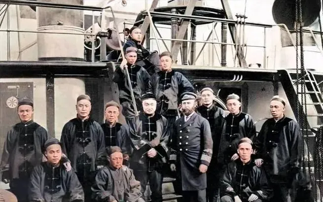 这个穿着立领黝黑军服、挨着白胡子洋教官站的,就是邓世昌,他的衣扣从脖颈一路扣到肚脐,亮得像一排小星,他不摆架子,手自然垂着,脚微微岔开,像随时要往前挪半步,旁边的洋教官帽檐压得低,眼神却不冷,两个人的肩膀几乎挨上了,这距离说明不少事。