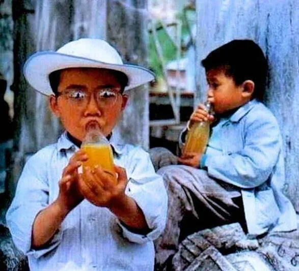 图里孩子一手捏着玻璃瓶桔子水,嘴贴瓶口噗呲噗呲喝,桔子水清清亮亮的,比现在汽水瓶小一号,喝的时候还得自己拿勺搅一搅,糖分没有现在这么冲,却解渴舒爽,夏天放学路上小卖铺给一瓶,兄弟俩比赛看谁先喝完,现在讲究牌子新潮,瓶子回收没人要,那个时候一瓶能玩一天,空的还拿来装泥巴河水。