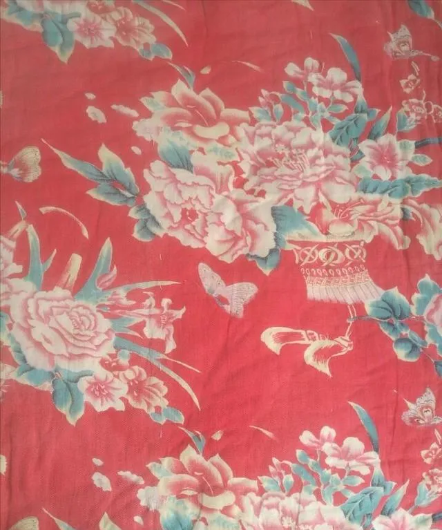 图中这块布带花色的被单,八十年代结婚必备,床上一铺就是满满的吉庆味道,大红底上开出牡丹、蝴蝶,印色猛、手感厚、贴身睡不烫,小时候只知道冬天钻进被窝蹭妈妈的怀抱,妈妈说:“结婚那年你姥姥亲手给做的新被面,一针一线看得见”,用多少年也不掉色,夏天叠着冬天盖着,现在翻出来还有余温。