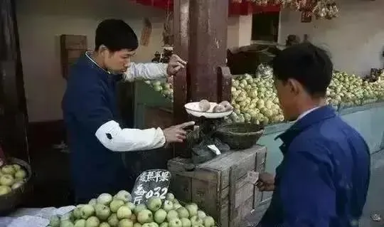照片里的水果摊老板一手指着杆秤一手递纸票,满摊青苹果和旧秤砣,交易时只认斤两分毫不差,顾客盯着秤看,老板嘴里还在念叨:“今天的果子新摘的,老秤不会骗人”,杂货店、果摊、早点摊全都一个路数,买卖讲究明码实价。