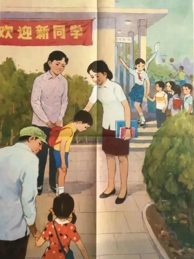 这页老课本一翻开,红底条幅写着“欢迎新同学”,老师带着笑容蹲着问孩子:“你叫什么呀,是不是第一次来学校”,小孩挎着书包扭扭捏捏,家长在一旁陪着鼓励,这样的场景谁忘得了。