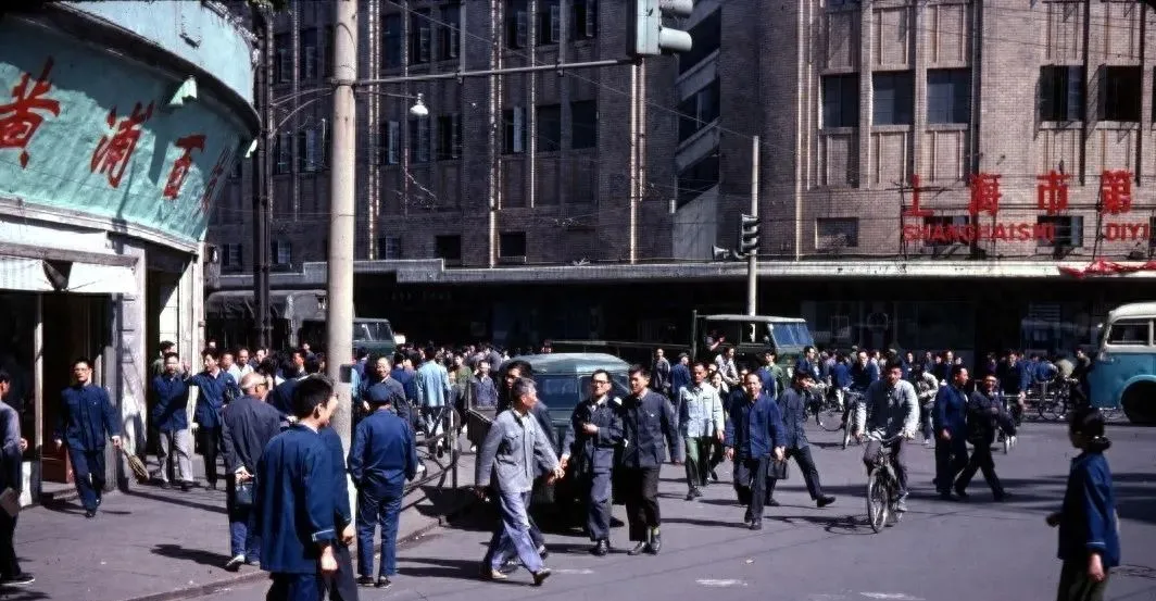 图中这一幕叫上下班潮,灰蓝色中山装一片,单车从人缝里钻,公交车慢吞吞打着气走,拐弯那家老百货外墙油漆起皮了也照样热闹,妈妈说那会儿约人最简单,站在路口等着就行,人一拨拨过去,总能撞上熟人。