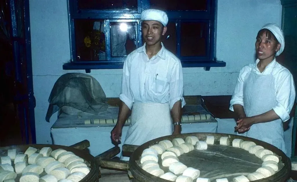 这个热腾腾的叫国营面食间,两口大蒸笼摆成圆,馒头按顺序码成圈,白得发亮,抹布盖在案板上醒面,师傅的围裙油光发亮,奶奶说那时的馒头真香,掰开能看见细细的蜂窝眼。