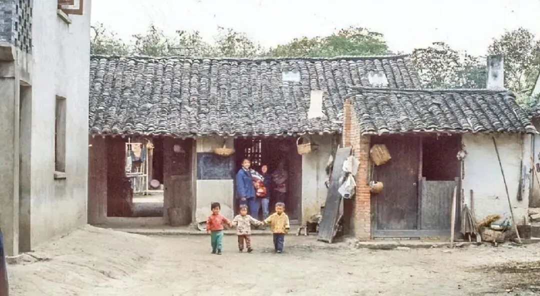 这处叫老式瓦屋,屋檐下吊着撮箕和竹篮,门板用横闩一拴就稳当,地上是踩实的黄土,雨一冲就泥汪汪,堂屋里挂着黑白照和年画,院口三个孩子手拉手跑,笑闹声能把鸡都惊上墙。