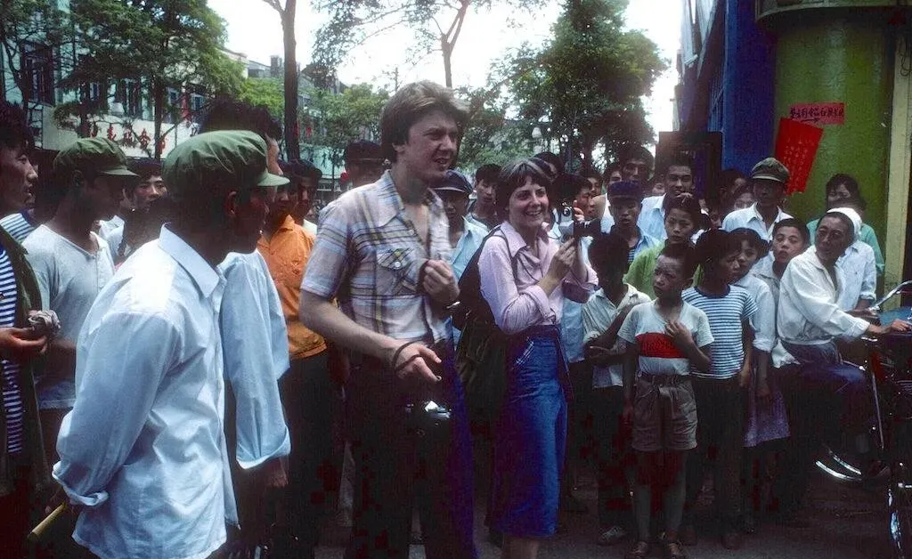 照片里的热闹叫看热闹,两个洋面孔挤在人群中间,手里攥着小相机,旁边小伙子把衬衫塞进裤腰,忍不住往前凑,叔叔说那年头街上一有稀罕物件,人能刷一下围成三层。