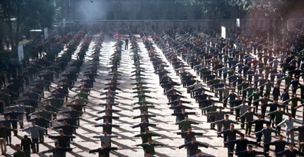 这排山倒海的阵仗叫早操,黑蓝绿三色在人群里铺开,胳膊抻到一条线,口号压在胸腔里往外顶,哨子一响整片人影一起转身,阳光从树梢里洒下来,地上影子像鱼鳞。