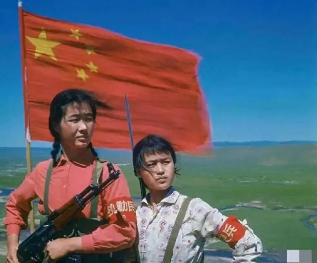 这个画面不用问,就是七八十年代的标志,两个姑娘一个梳着麻花辫,一个头发剪得利落,袖标上写着**“劳动”和“出击”**,后头大红旗招展,天格外蓝,底下一大片草原没别的修饰,两个人站那儿,手握着枪,像把所有的“志气”都顶在下巴上了,妈还给我讲过,她们村的姑娘那阵上山放哨,晚上回来鞋上全是泥,累了也绝不掉队,嘴上不叫苦,心里想着守住家里的地,远处要是有大喇叭响,全村跟着提心吊胆。