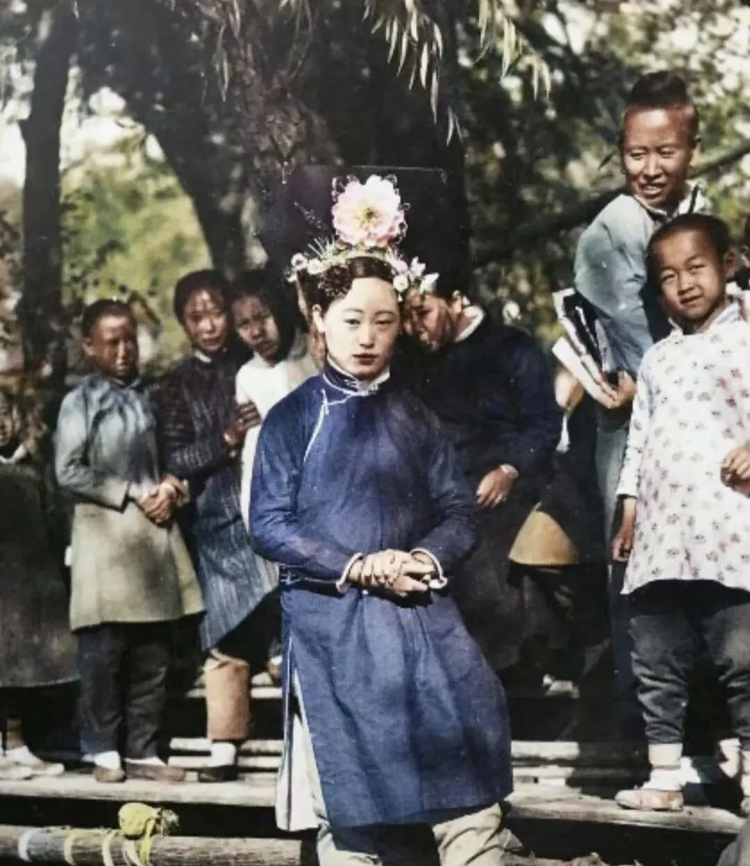 图中这位穿深蓝长袍的女子,头上顶着大拉翅一样的黑色翼状头饰,中间簪着一朵粉白并蒂花,耳边坠子微微晃,她手上几只粗银镯叠在一起,阳光一照亮汪汪的,孩子们围在旁边看热闹,像看戏又像看明星,奶奶以前说见着宫装打扮的人,脚步都要慢半拍,谁不想多看两眼呢。