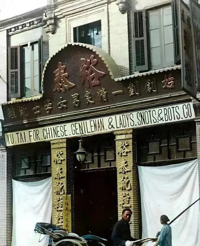 这个铺面叫裕泰靴鞋庄,牌匾是深褐漆地嵌金字,立柱上还刻着行楷对联,檐下挂一盏胖胖的煤气灯,门脸下面横着一条英文长招,拼写稀奇古怪却格外显摆,车夫把车把一撂,探头往里问价钱,掌柜吊着圆眼镜,手里算盘一拨拉,铜珠子嘀嗒嘀嗒地响,爸爸看这张图只说了一句,老字号的面子,就是写在门脸上的。