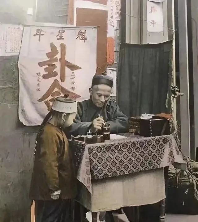 这个摆着八仙桌的小摊叫算命摊,摊主剃着平头,眉尾有点垂,面前堆着竹签木盒和一碟朱砂,后头挂一幅大字帘子,写着“平安观”三个字,小男孩侧着脑袋看他写符,眼珠子跟着毛笔转,姥爷年轻时也摆过几天摊,他说最忌讳句句吓人,留三分余地,让人走着放心才会回头再坐一卦。