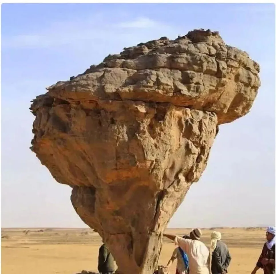 这个顶大底小的石头叫蘑菇岩,风把沙当砂纸,年复一年去刻它,粗糙的黄里带红,底座尖得让人替它捏把汗,我第一次见这种形状是在地理课本上,老师说别怀疑,它就这么倔强地立着,沙暴来了也不躲。