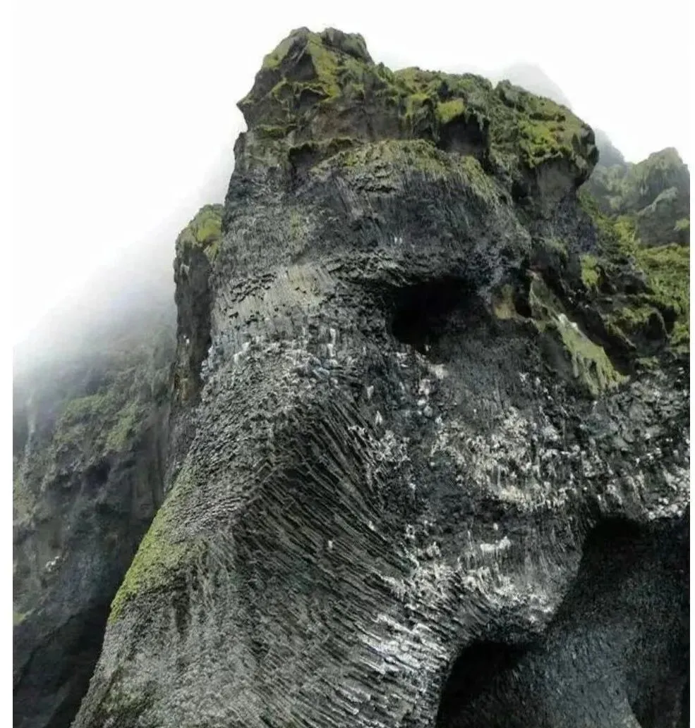图里这块黑灰的火山岩,远远看就是一头低头饮水的象,鼻子是整面岩壁的纹理往下压出来的弧,眼窝是个黑洞,海雾把边缘糊成柔软的线,妈妈说小孩看山会给它起名字,大人看久了又信了回去,这块石头像极了守海的老兽。