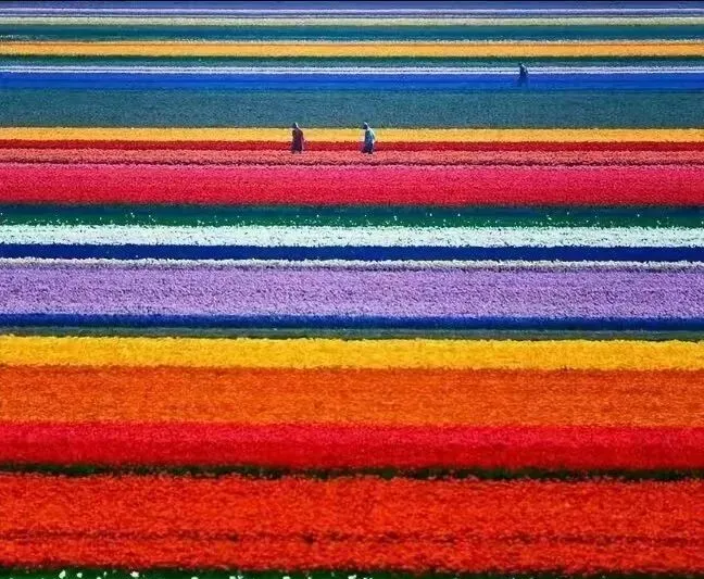 图中这条条彩带叫郁金香田,一道红一抹紫一片金,颜色排得像练字的格子纸,走在田埂上的人是会被颜色推着走的,奶奶看见这张就笑,说以前家里只有一盆绿萝,现在手机一滑,整面墙都是花。