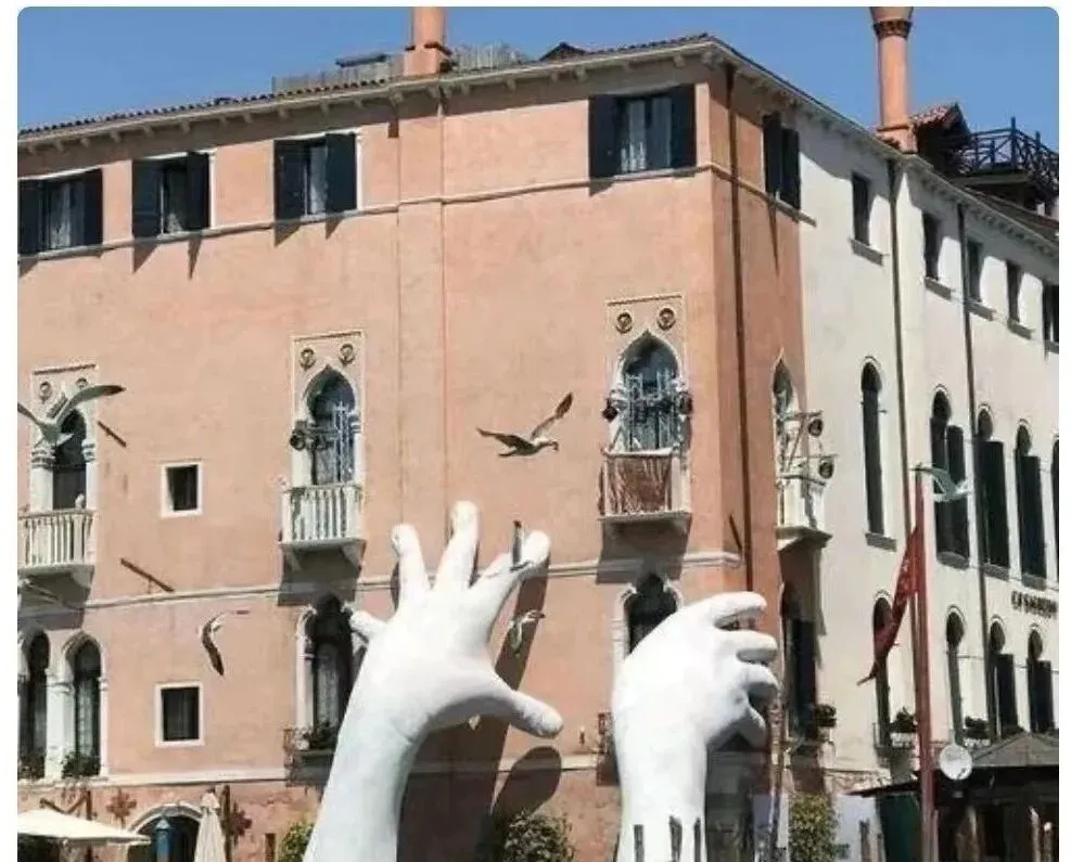 图中这两只伸出水面的白手叫支撑,手背青筋起,指节抬起来,像是正要扶住墙体,路过的海鸥在指尖掠过,城市是会喘气的,艺术家就用这对手提醒大家,水位涨上来时,谁都得想想怎样托住家。