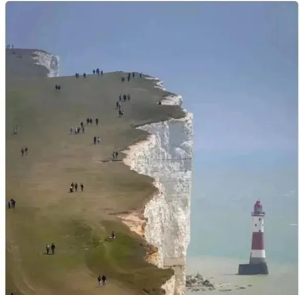 这个断面的白色悬崖叫白崖,边缘像被刀切过,海风往上顶,人沿着草坡慢慢走,尽头是一盏红白相间的灯塔,像把针,扎在海里给船只指方向,以前我们对着地图背地名,现在走到崖口才懂一句话的分量,别再往前一步。