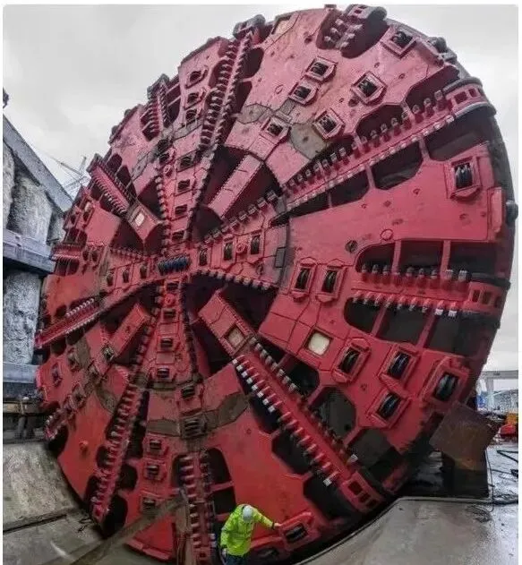 这面通红的大圆盘叫刀盘,齿块一块块嵌着,转起来就往前啃山,站在旁边的工程师穿荧光衣,个头只到一块齿的高度,城里的地铁一站一站延长,背后就是这张铁脸不眠不休地咬。