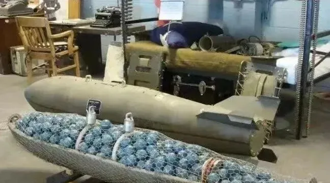 这个网兜装满小球的家伙叫集束炸弹,外壳像个胖鱼雷,肚子里却是无数小颗粒,最怕的是有些没炸开的会躲在草丛里,等着误伤路人,外婆不让我们在废弃工棚附近玩,就是这层担心。