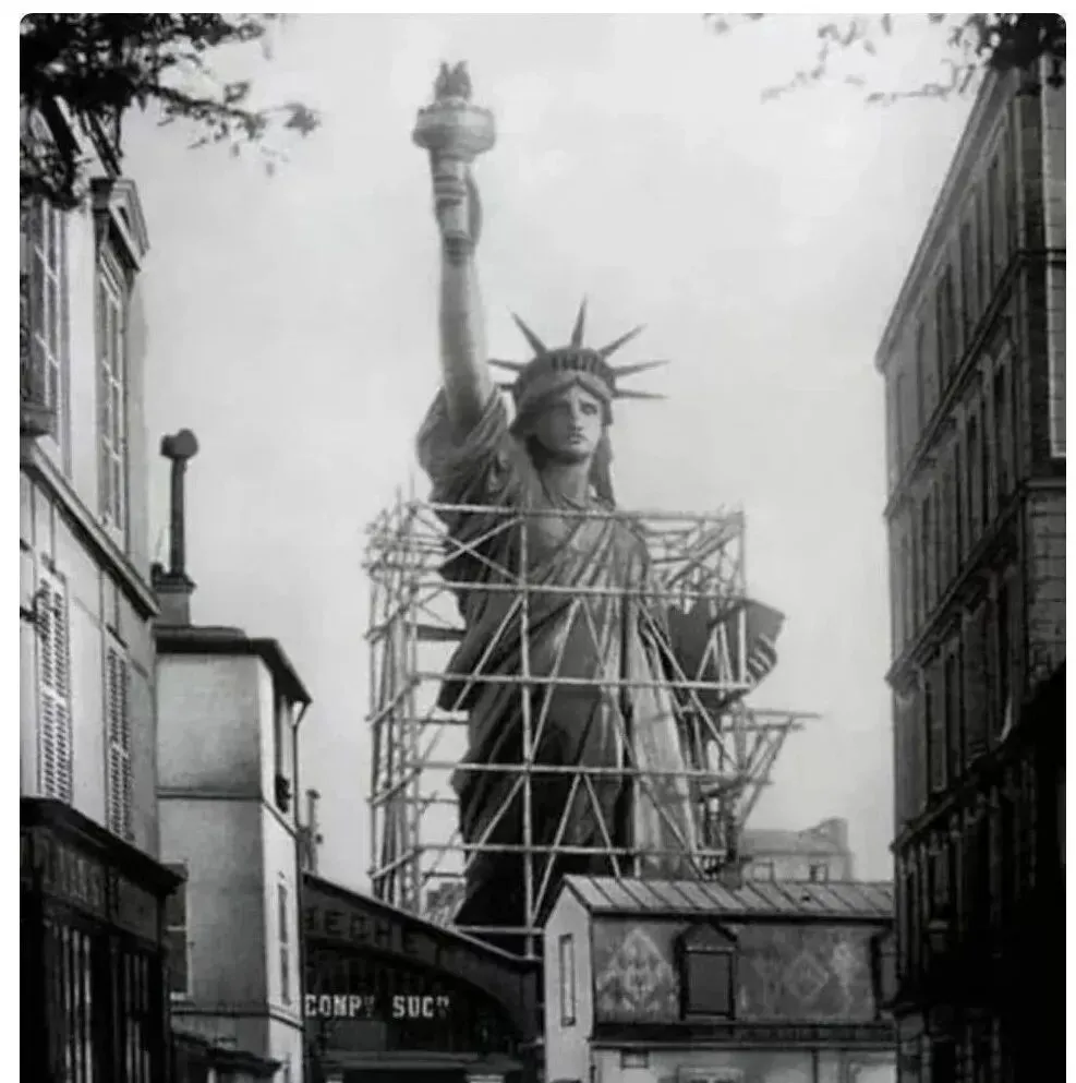 这张脚手架林立的照片,记录的是自由女神像在巴黎制作时的样子,铜板还没上色,骨架直愣愣地露着,街角的人抬头看,像看一位尚未穿礼服的姑娘,等它拆解装箱远渡重洋,另一头的海湾才会多出一盏象征的火焰。