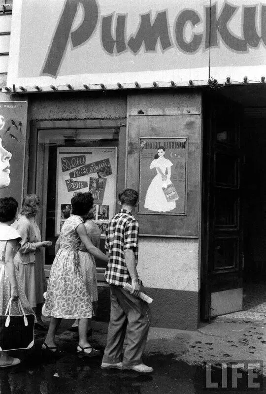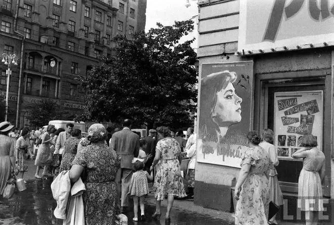 1960年,苏联首都莫斯科的街头,熙熙攘攘的人群,一旁的是电影院的电影海报。