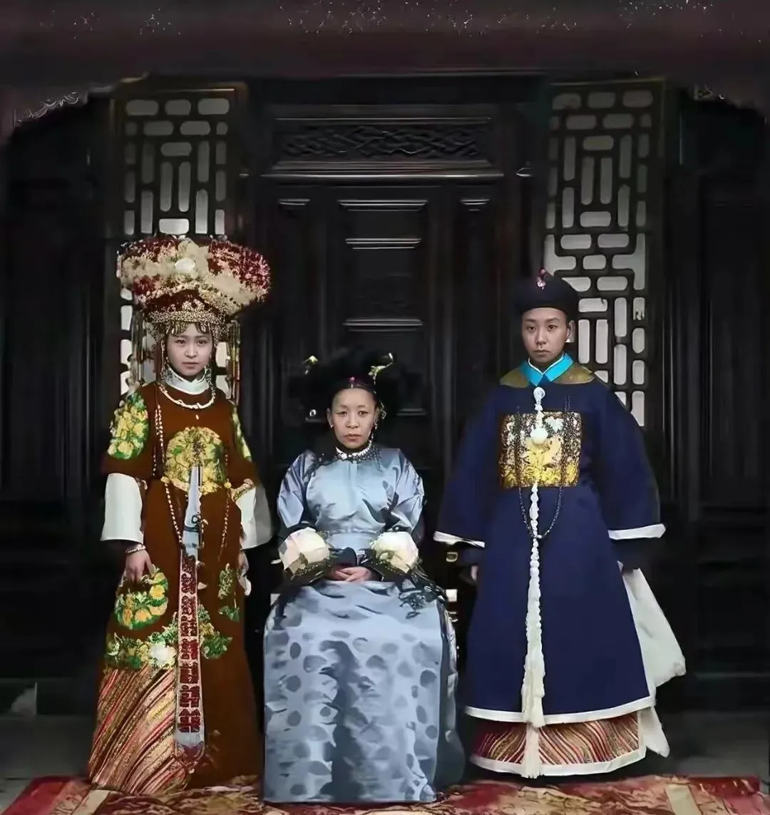 图中这身华重的礼服叫朝袍,缎面发亮,胸前挂着长长的珠串,女孩头上那一顶凤冠压得人都不敢喘大气,花丝金叶一层叠一层,站在黑漆雕花屏风前,颜色被衬得更深更稳,奶奶看见说当年缝金线得眯着眼一针一线来,错半指都不成。