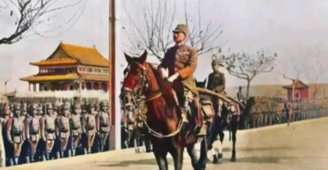 这个马队叫入城式检阅,马鞍上铜环叮当,马蹄踏在石板上咚咚作响,城门楼的檐角在后面压着,队列一线排开,风一吹旗带直直的,气氛冷得很。
