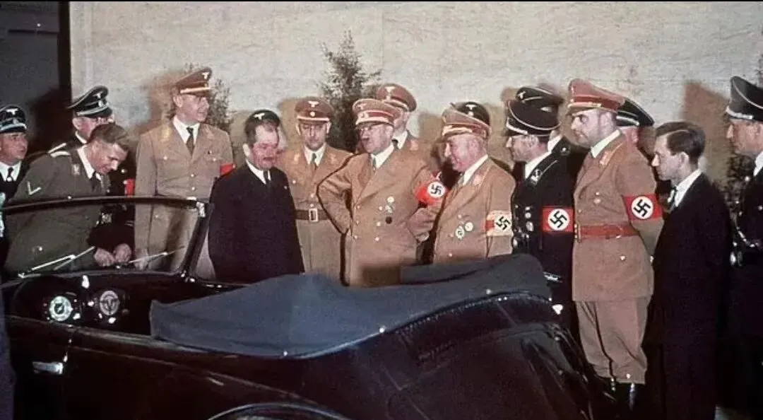 图里这辆敞篷车是礼赠的座驾,黑得能照出人影,围着的军装扣子亮得发光,胳膊上绑着臂章,几个男人凑近车头指指点点,像在商量什么细节,话音压得很低。
