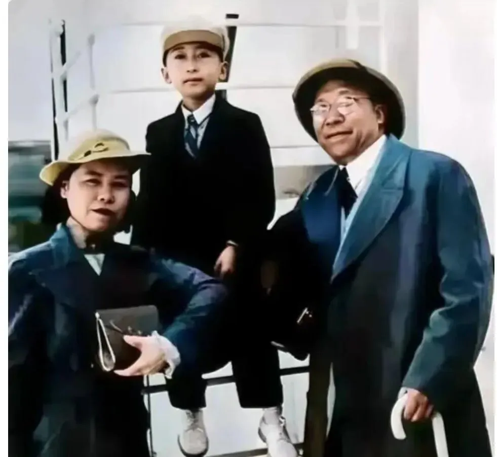 这张带着海风味道的叫出行照,呢子大衣配窄檐帽,男孩的短袜白得发亮,鞋尖翘着坐在船梯边,妈妈把手包按在怀里,爸爸拄着伞,嘴角带笑,像要去很远的地方。