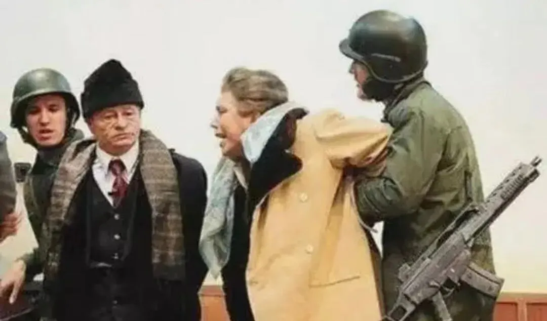 这张抓拍的场景叫押解,屋里灯光白得刺眼,士兵的枪背在身后,女人被按着肩膀往前推,她回头喊了一嗓子,我们家的老人看一眼就合上了相册,说这一下就走到尽头了。